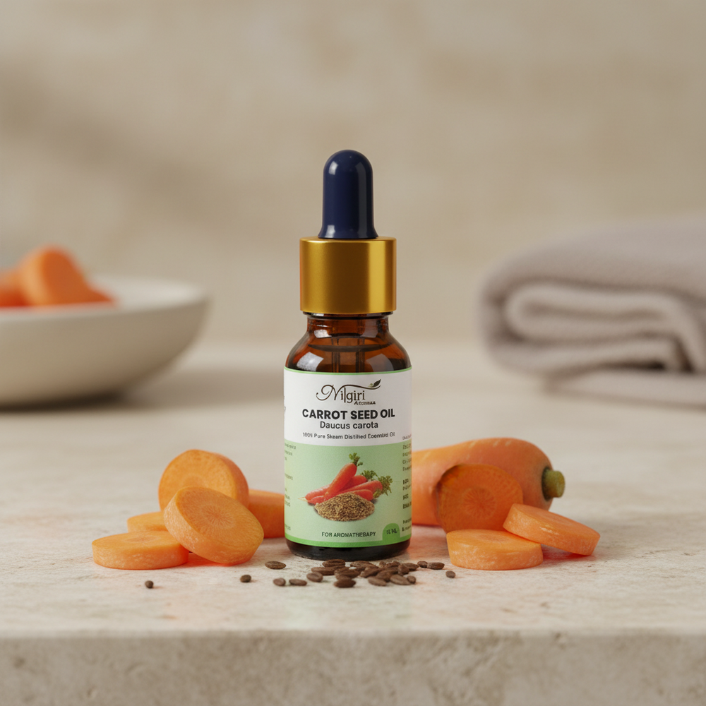 Nilgiri Aromas' Carrotseed Essential Oil is derived from the seeds of the Daucus carota plant using the traditional steam-distillation process. This ensures the preservation of its pure and therapeutic properties. The oil has a warm, earthy, and slightly sweet aroma and is golden yellow to amber in color. It is highly concentrated and should be used in dilution with a carrier oil for topical application.